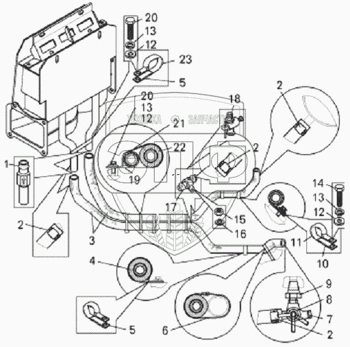 Каталог запасных частей к технике: БелАЗ-7823. Установка трубопроводов отопителя