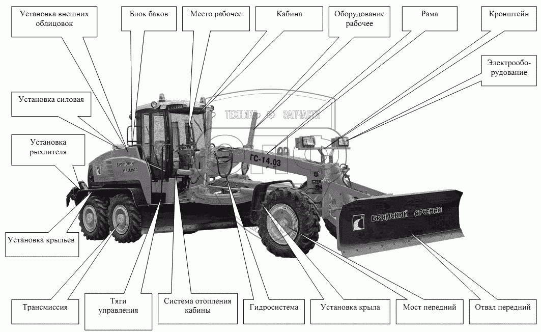 Каталог запасных частей к технике: Брянский Арсенал ГС-14.03. Расположение узлов и систем