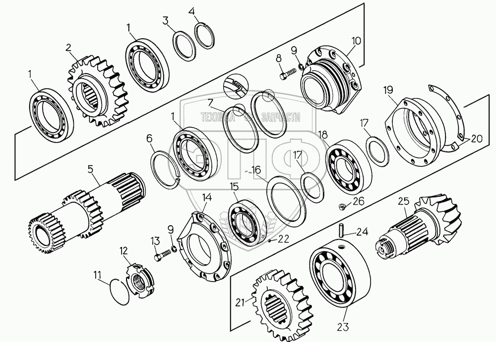 Каталог запасных частей к технике: ЧТЗ Бульдозер Б11. Вал-шестерня с деталями