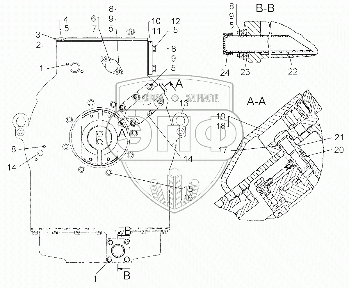 Каталог запасных частей к технике: ЧТЗ Бульдозер Б14. Коробка передач, детали крепления