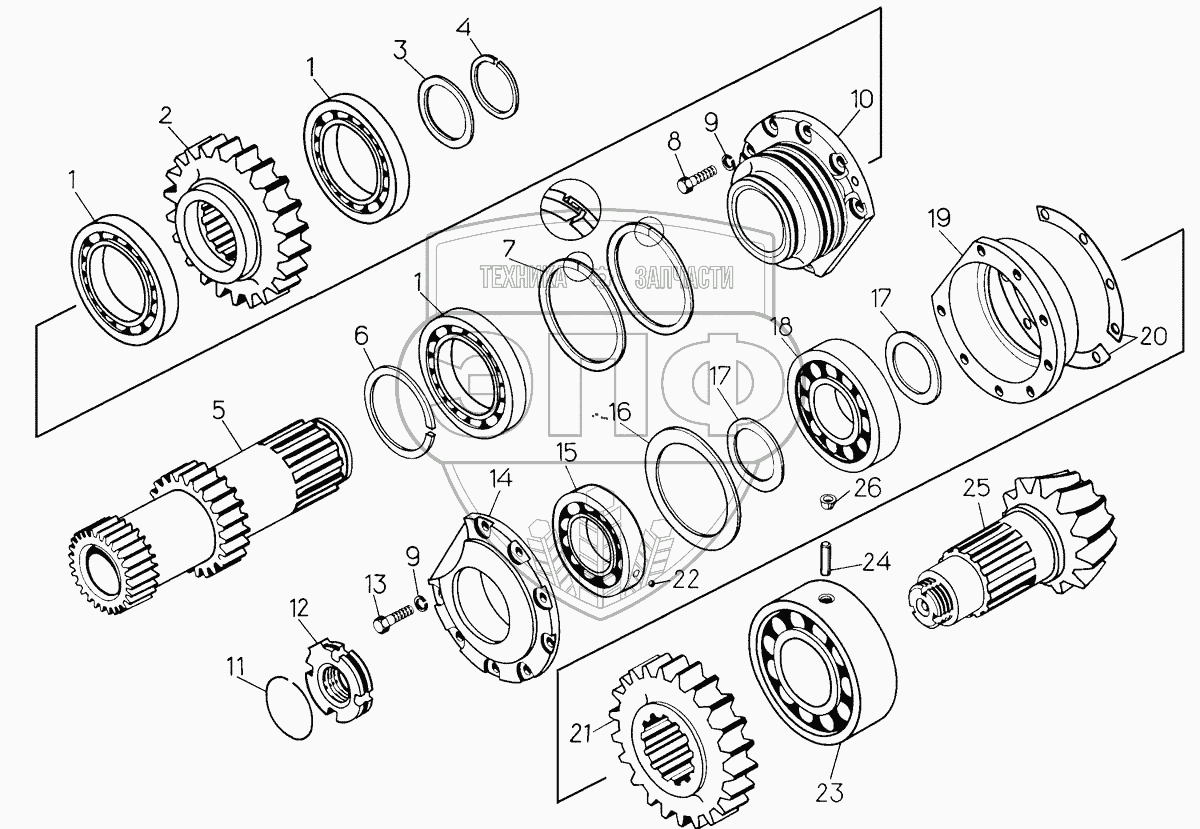 Каталог запасных частей к технике: ЧТЗ Бульдозер Б14. Вал-шестерня с деталями