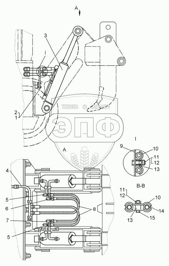 Каталог запасных частей к технике: ЧТЗ Рабочее оборудование Б10М. Установка гидроцилиндров и трубопроводов