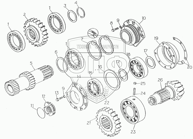 Каталог запасных частей к технике: ЧТЗ Т-10.02. Вал-шестерня с деталями