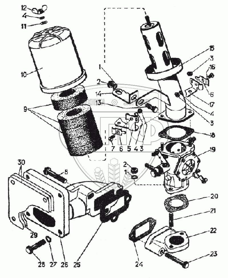 Каталог запасных частей к технике: ЧТЗ Т-130. Воздухоочиститель, карбюратор, выхлопной патрубок