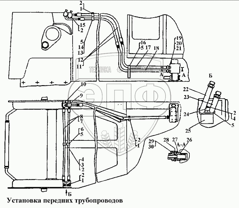 Каталог запасных частей к технике: ЧТЗ Т-170. Установка передних трубопроводов