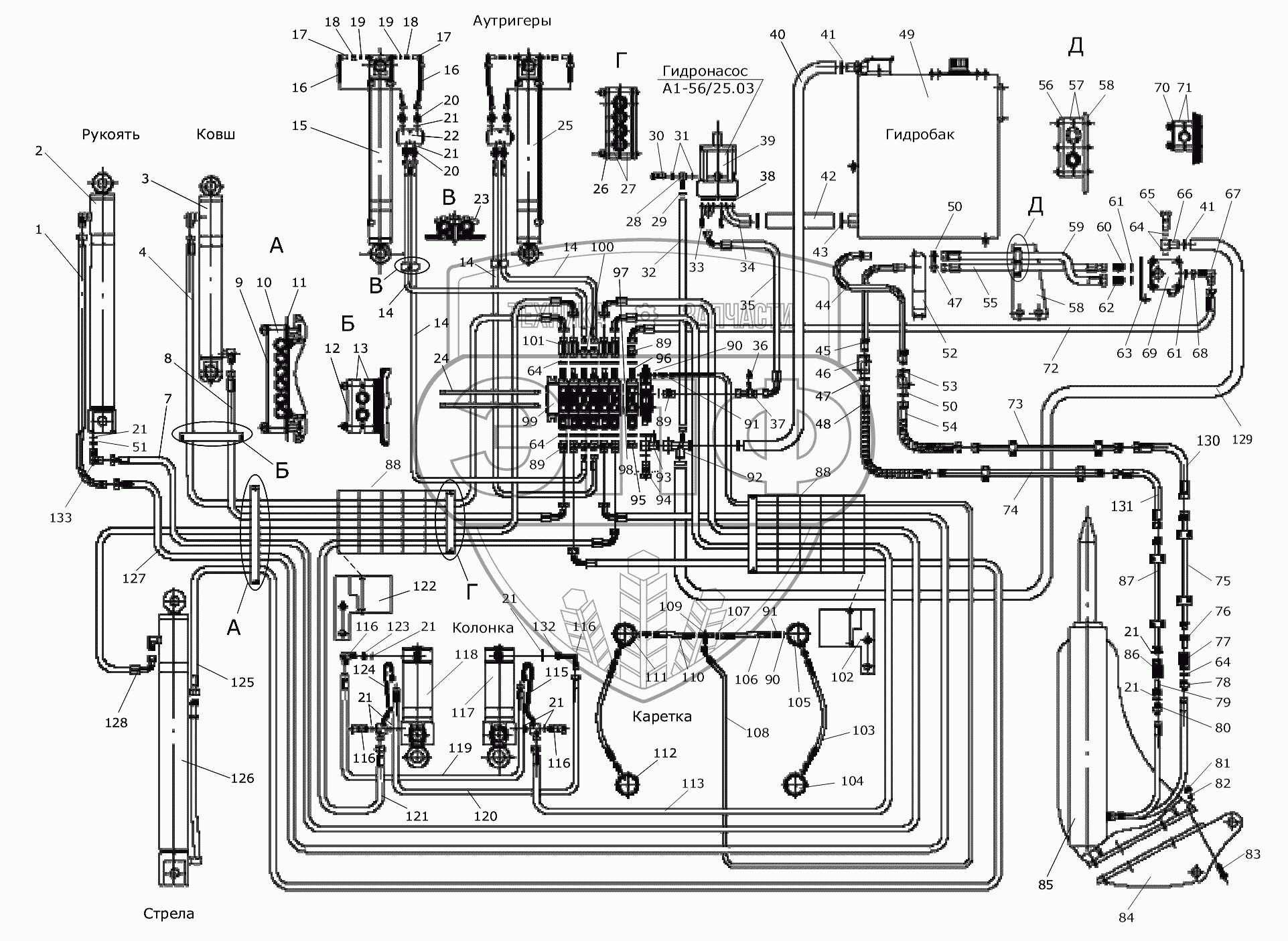 Каталог запасных частей к технике: Дорэлектромаш ДЭМ-114. Гидросистема экскаваторного оборудования