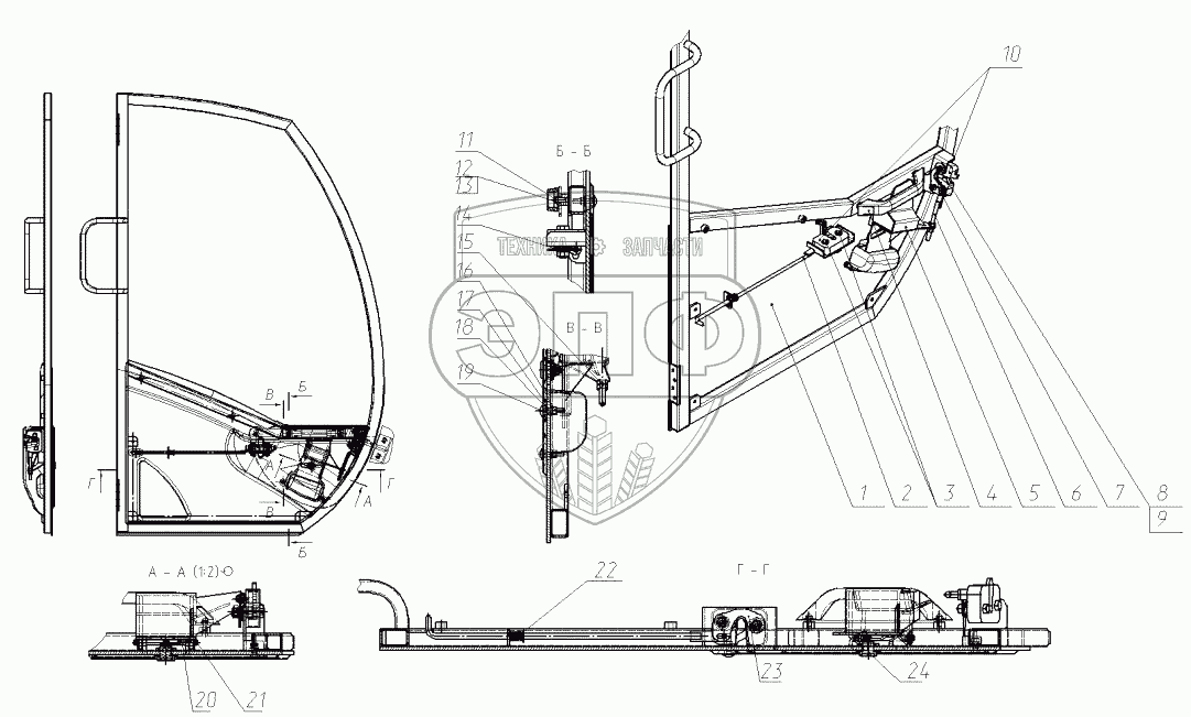Каталог запасных частей к технике: ЭКСМАШ E160W. Дверь кабины 130-00-23.40.000