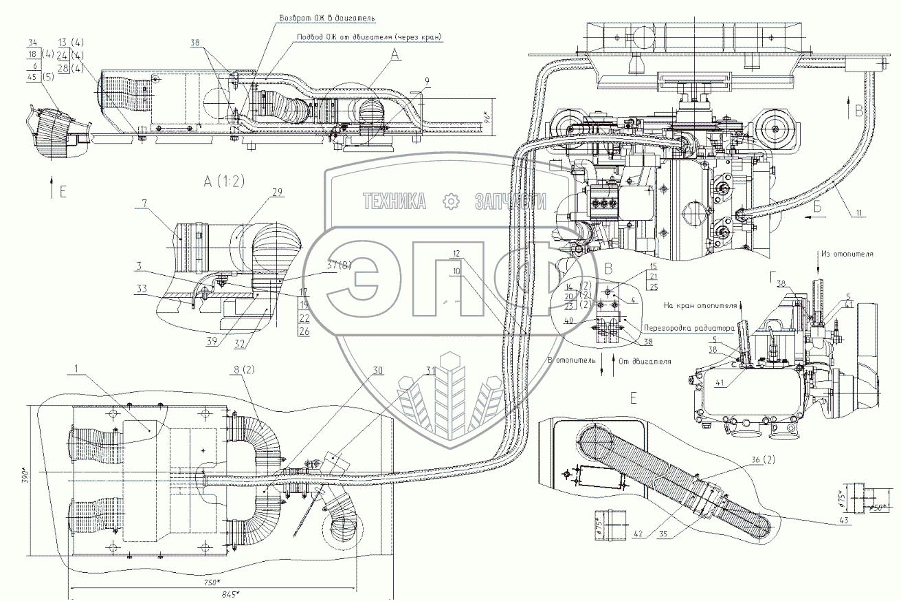 Каталог запасных частей к технике: ЭКСМАШ E180R. Установка отопителя 130-00-25.00.700