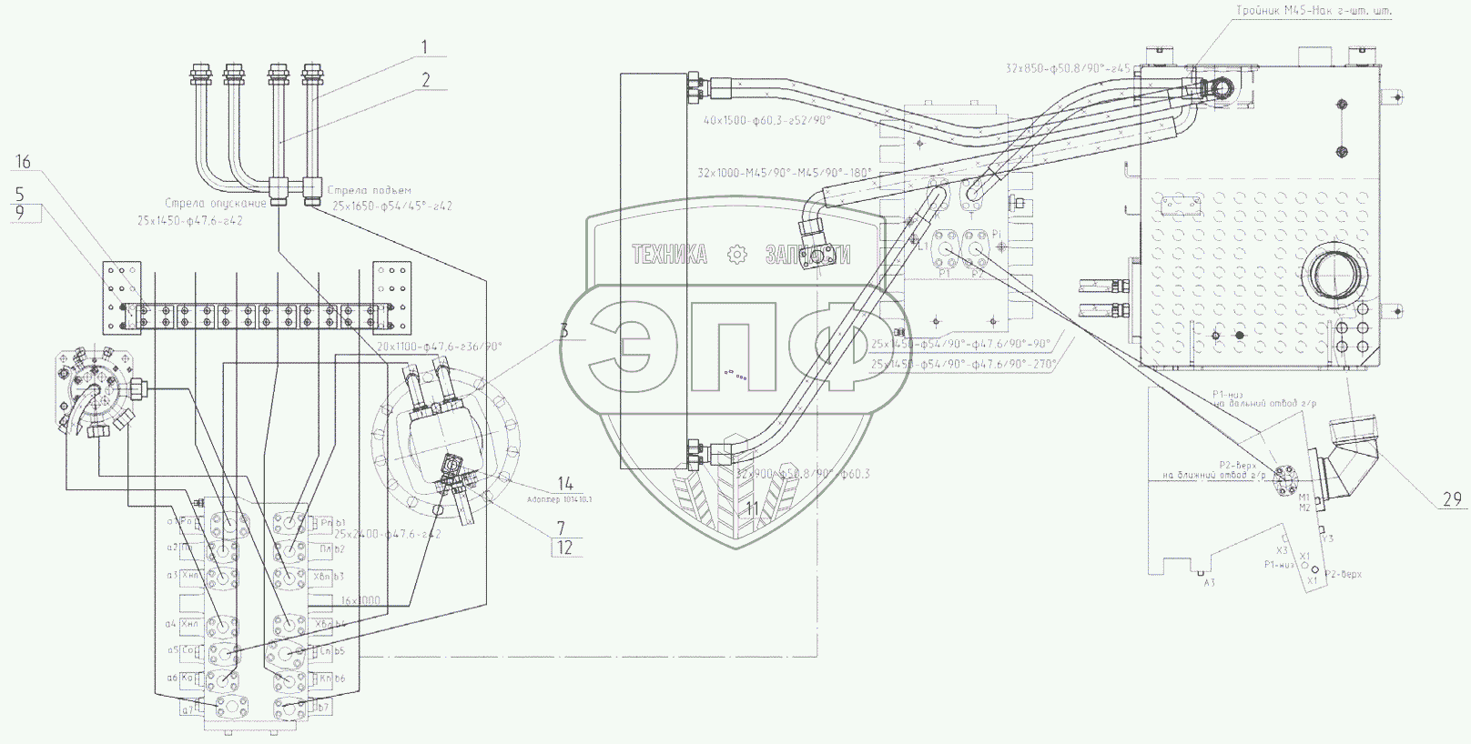 Каталог запасных частей к технике: ЭКСМАШ E230W. Трубопроводы на поворотной платформе