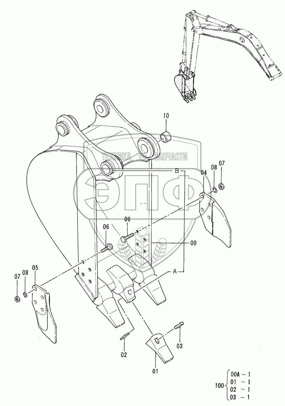 Каталог запасных частей к технике: Hitachi EX-100-3. BUCKET (0.3)<JIS94>