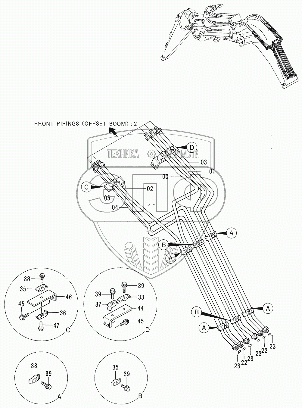 Каталог запасных частей к технике: Hitachi EX-100-3. FRONT PIPINGS <OFFSET BOOM> 1