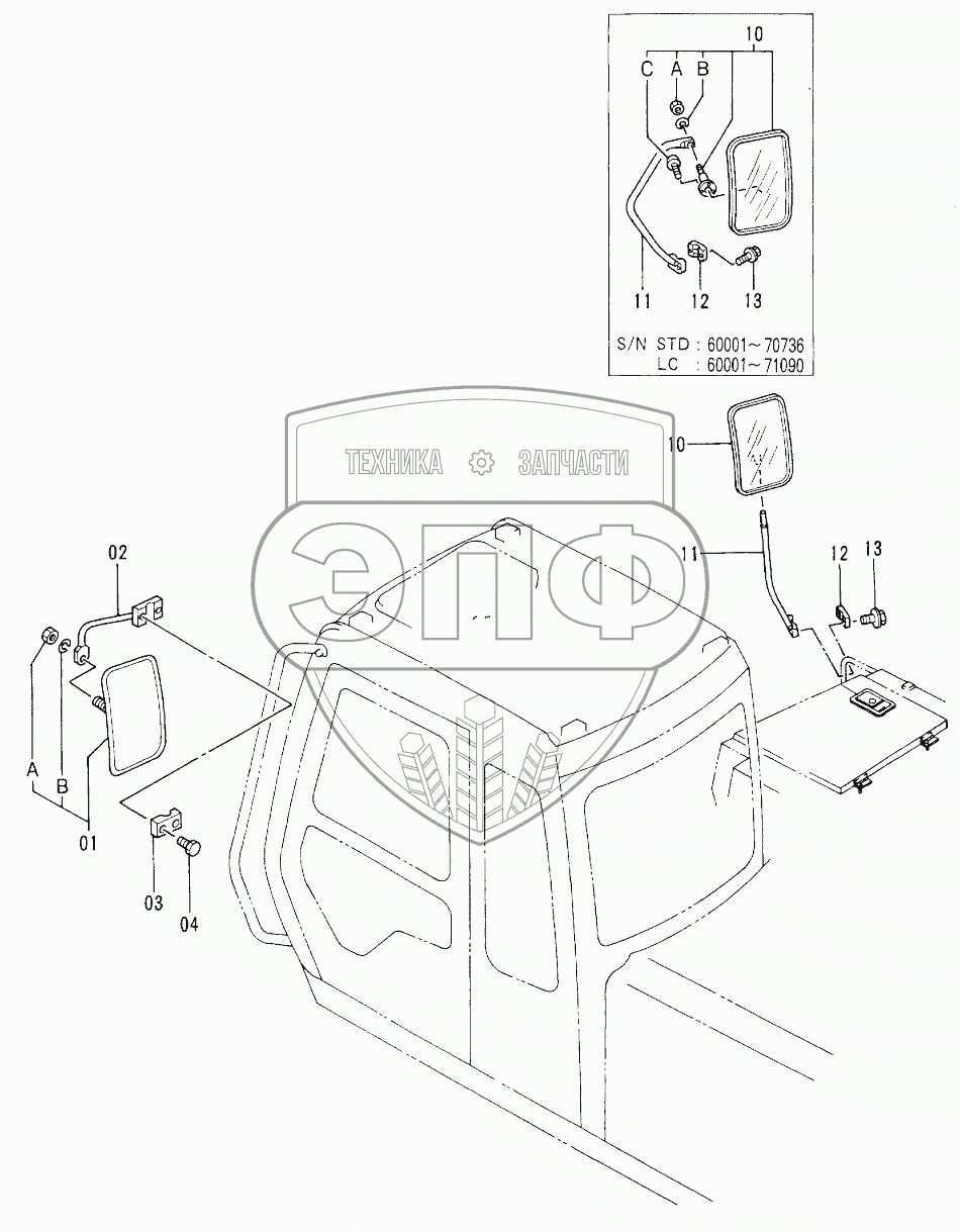 Каталог запасных частей к технике: Hitachi EX-200-2. REARVIEW MIRROR 60001-