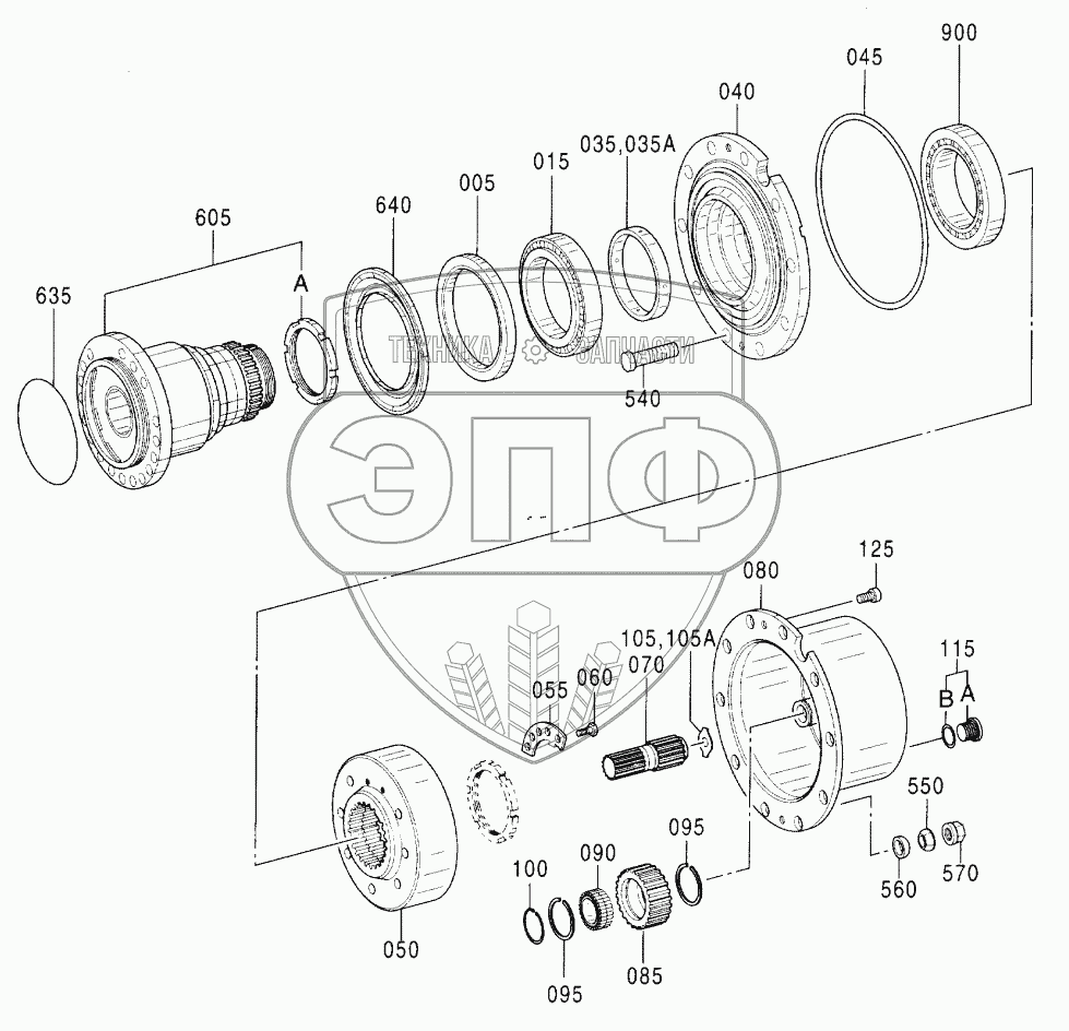 Каталог запасных частей к технике: Hitachi Компоненты ZX-160W. AXLE, REAR (4) (DRUM)