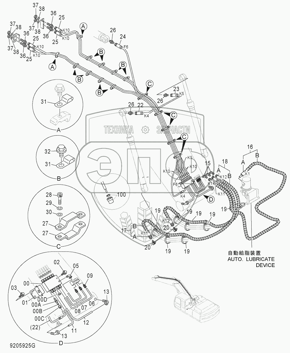 Каталог запасных частей к технике: Hitachi ZX-330-3G. AUTO. LUBRICATE PIPING (BOOM)