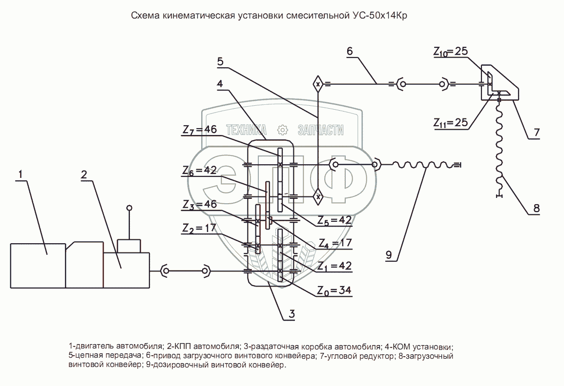 Каталог запасных частей к технике: Ижнефтемаш УС-50х14Кр. Схема кинематическая установки смесительной УС-50х14Кр