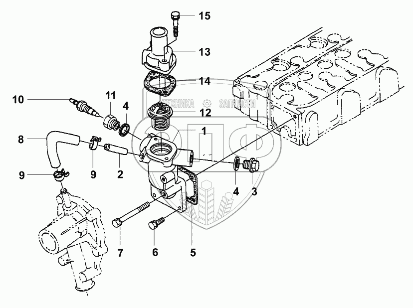 Каталог запасных частей к технике: JCB VM-1500-1601300. Водяной фланец и термостат