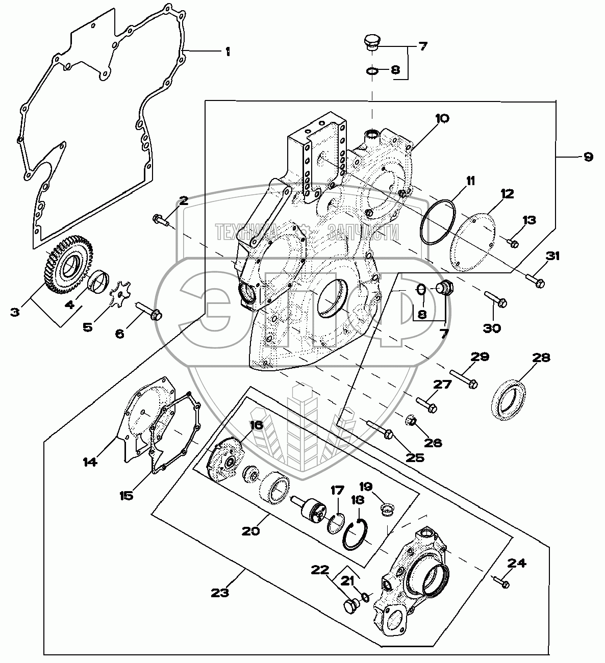 Каталог запасных частей к технике: John Deere JD-315SK(часть 1). Крышка распределительной шестерни