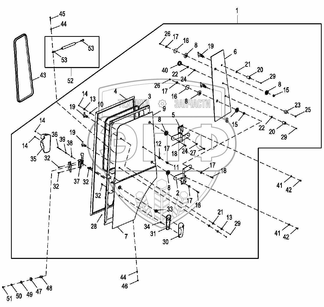 Каталог запасных частей к технике: John Deere JD-325SK. Дверь левая (кабина)