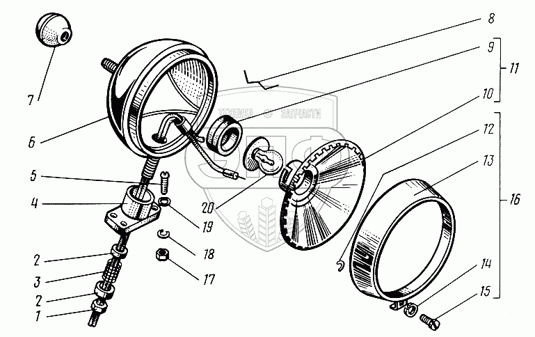 Каталог запасных частей к технике: Канаш-электрокар ЭП-2014. Фара поворотная ФГ16-3711000