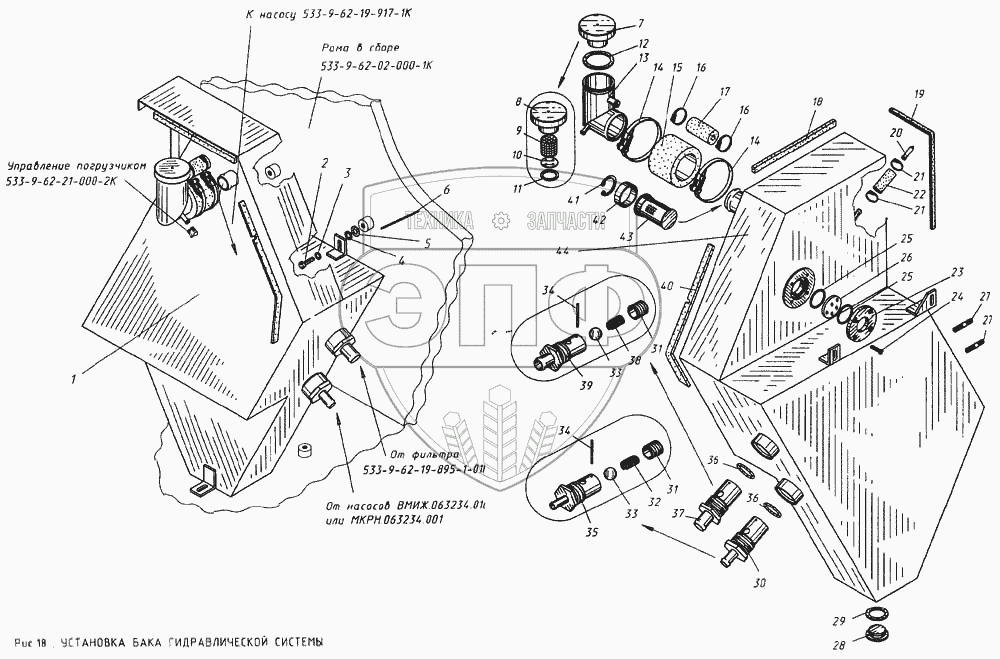 Каталог запасных частей к технике: КМЗ МКСМ-800. Установка бака гидравлической системы