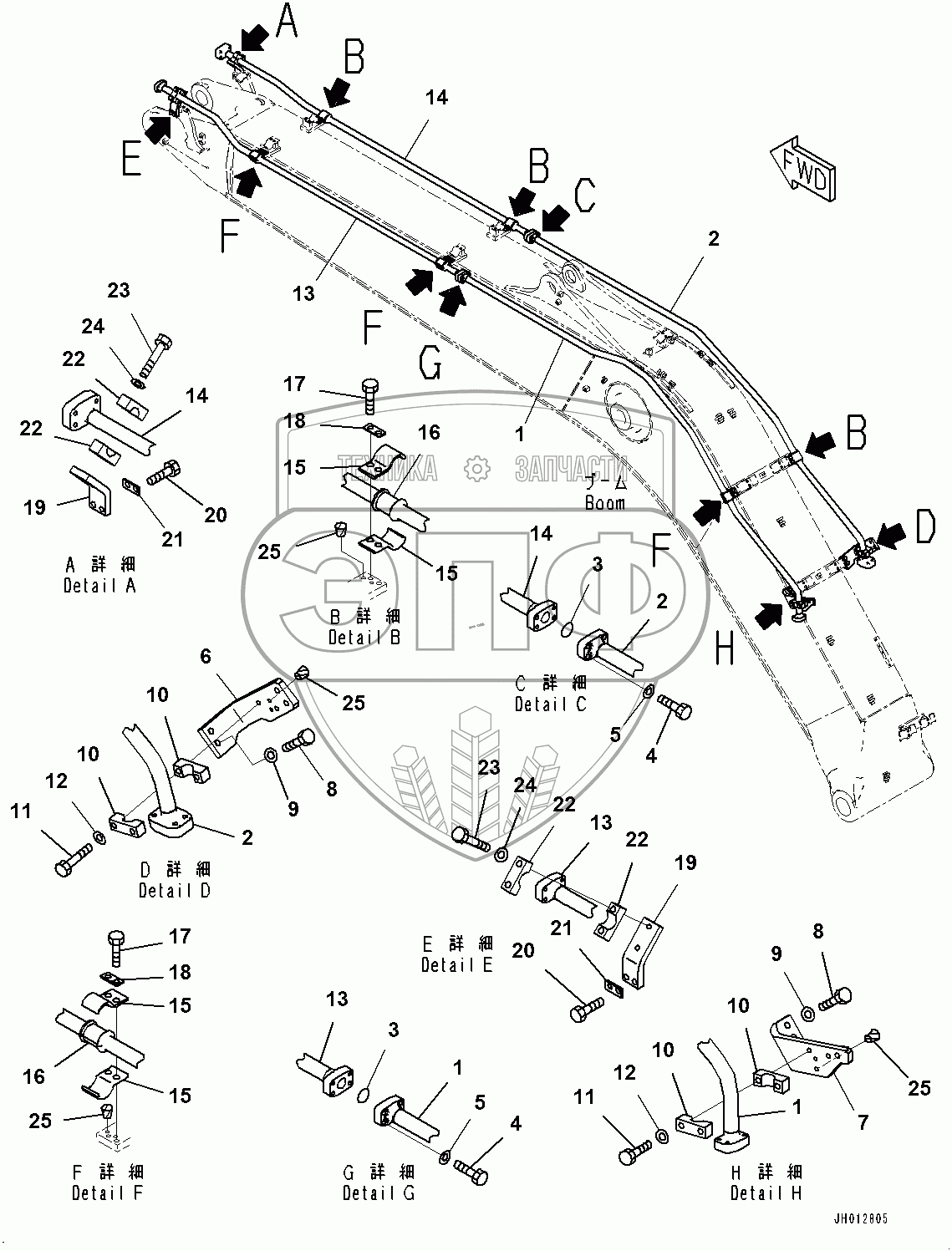 Каталог запасных частей к технике: Komatsu PC220LC-8MO. Boom, Additional Piping (#100001-)