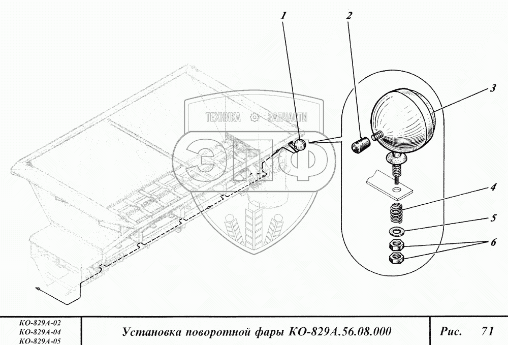 Каталог запасных частей к технике: Коммаш КО-829А. Установка поворотной фары