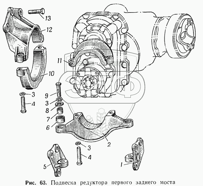 Каталог запасных частей к технике: МАЗ-537. Подвеска редуктора первого заднего моста
