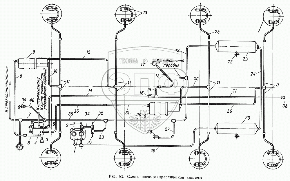 Каталог запасных частей к технике: МАЗ-537. Схема пневмогидравлической системы