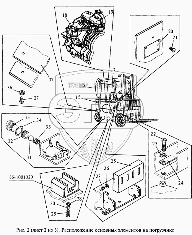 Каталог запасных частей к технике: МЗИК ДП-1604. Расположение основных элементов на погрузчике
