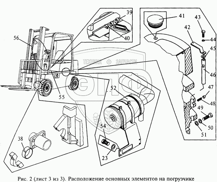 Каталог запасных частей к технике: МЗИК ДП-1604. Расположение основных элементов на погрузчике