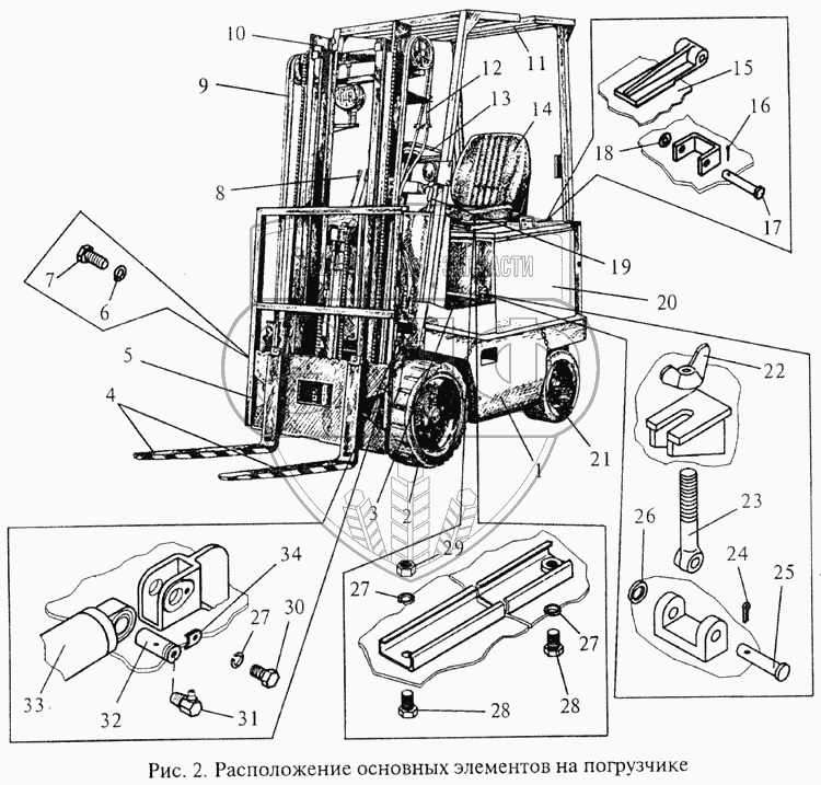 Каталог запасных частей к технике: МЗИК ЭП-103КО. Расположение основных элементов на погрузчике
