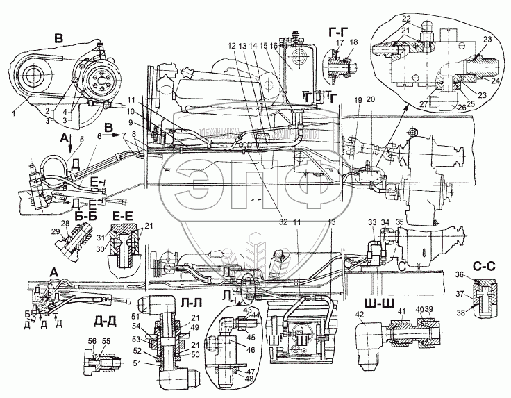 Каталог запасных частей к технике: МЗКТ-8006. Установка шлангов и трубопроводов