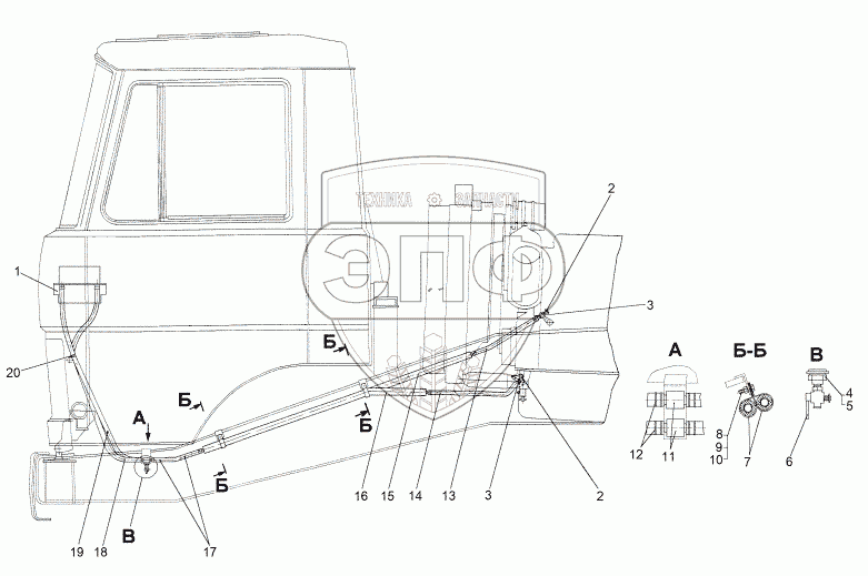 Каталог запасных частей к технике: МЗКТ-8006. Установка трубопроводов отопителя