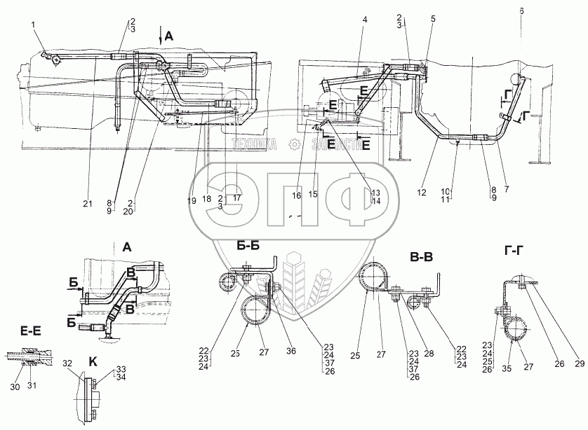 Каталог запасных частей к технике: МЗКТ-8006. Установка трубопроводов системы подогрева двигателя