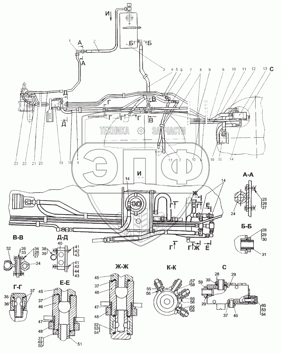 Каталог запасных частей к технике: МЗКТ-80211. Установка гидросистемы рулевого управления