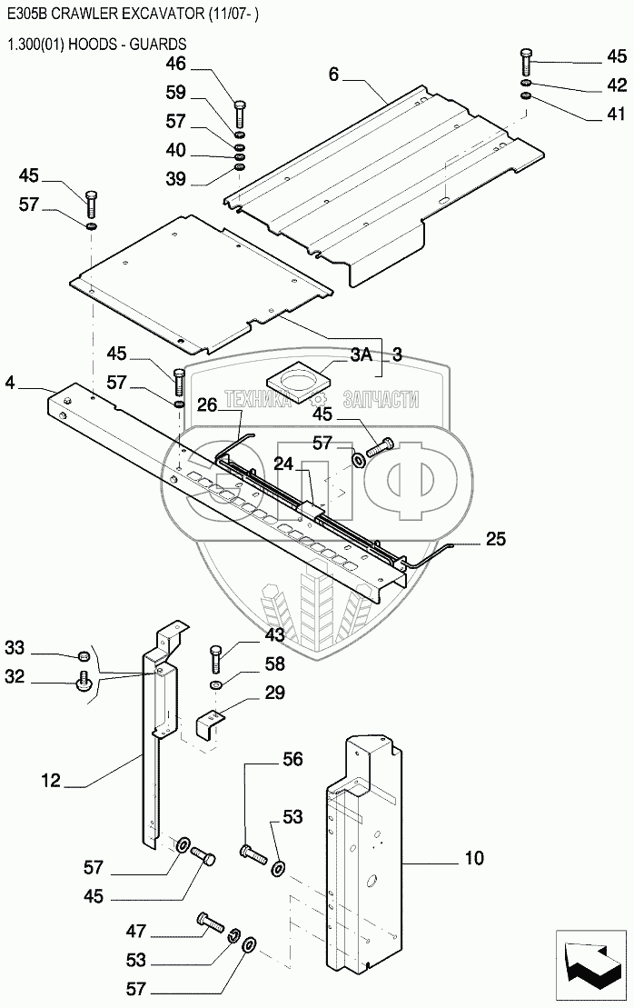 Каталог запасных частей к технике: New Holland Экскаватор E305B. Элементы облицовочные