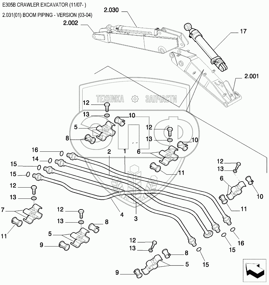Каталог запасных частей к технике: New Holland Экскаватор E305B. Трубопроводы стрелы