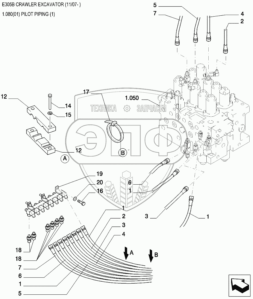Каталог запасных частей к технике: New Holland Экскаватор E305B. Трубопроводы управления