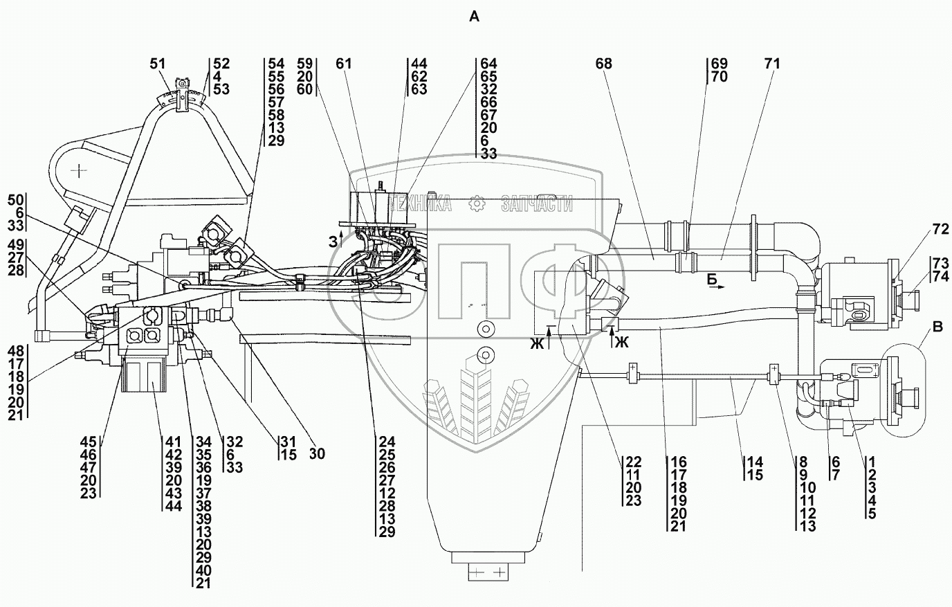 Каталог запасных частей к технике: Промтрактор ПК-12.02К. Установка гидросистемы