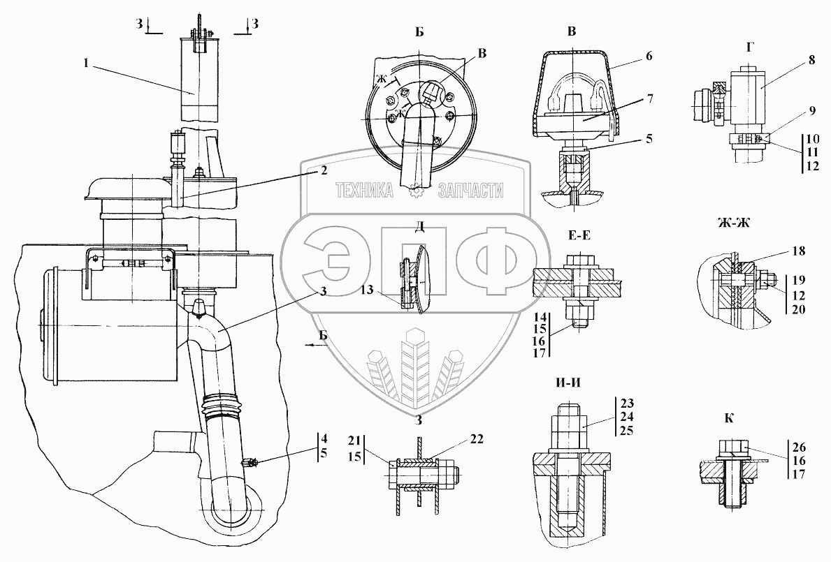 Каталог запасных частей к технике: Промтрактор ТГ-221КМ. Установка систем воздухоочистки и выпуска