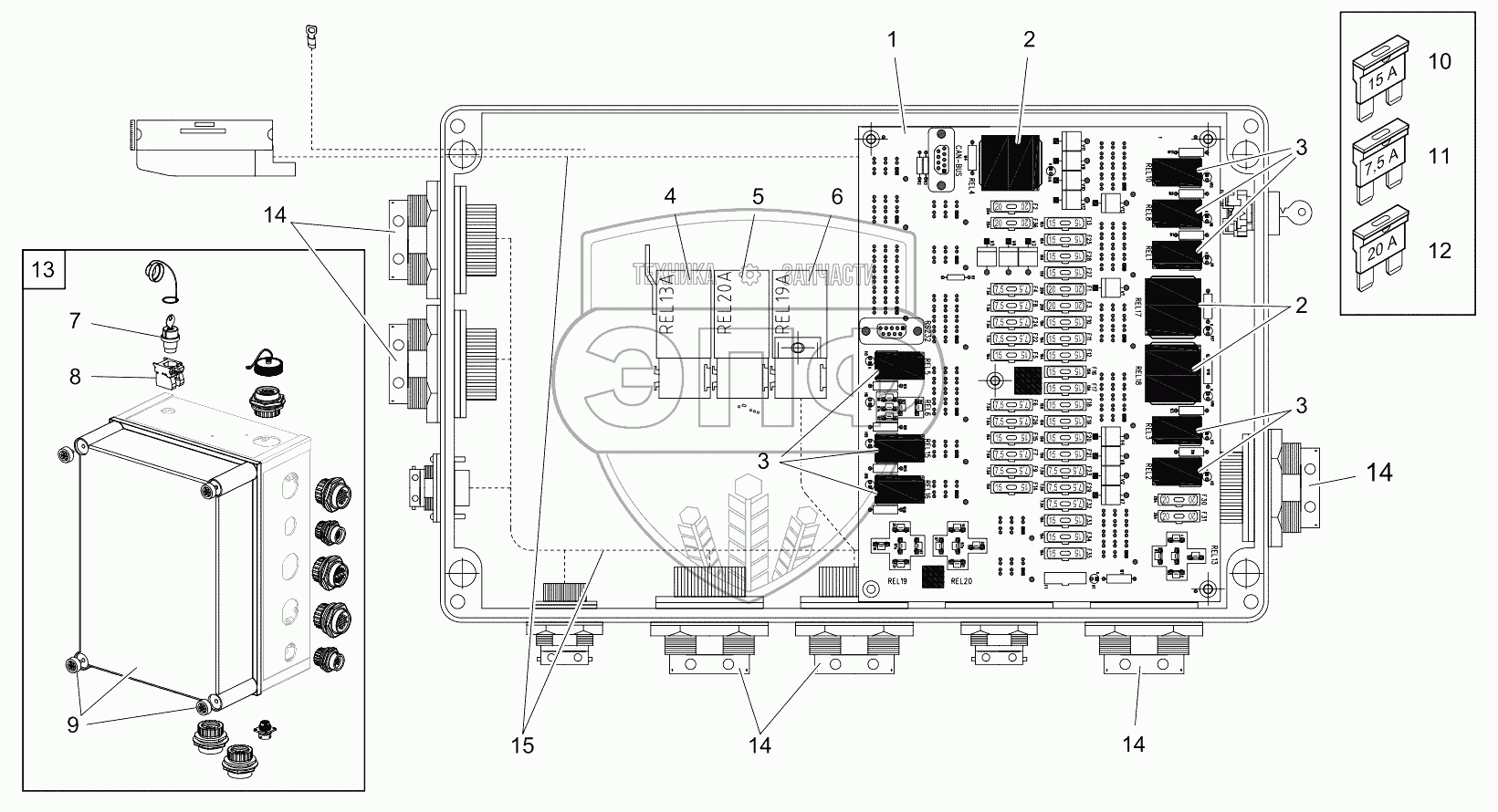 Каталог запасных частей к технике: RM-Terex RT35-1. SUPERSTRUCTURE RELAYS BOX