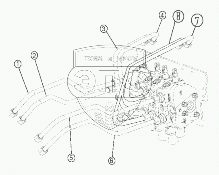 Каталог запасных частей к технике: RM-Terex TLB-825. Трубопроводы 3-х золотникового распределителя