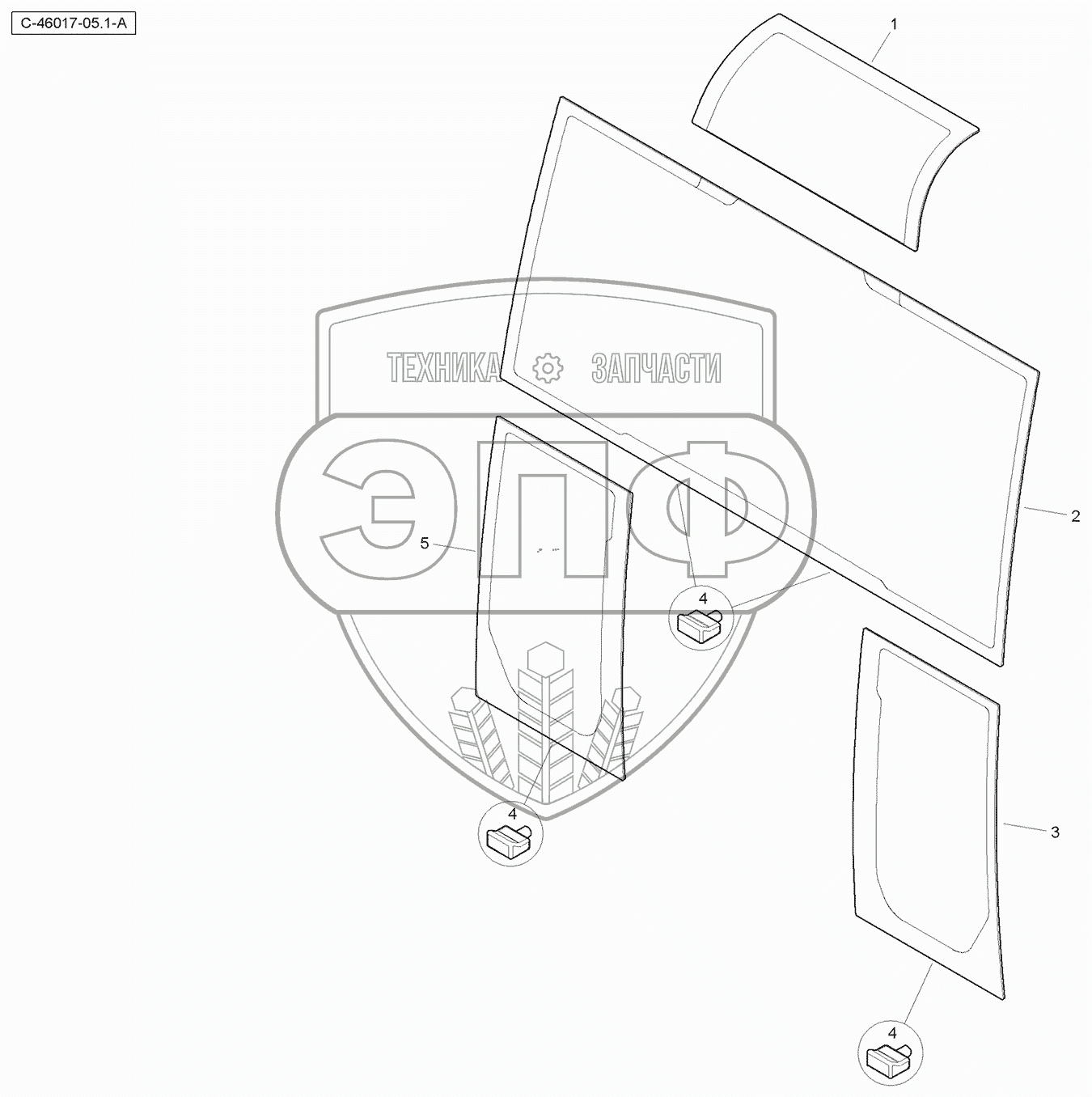 Каталог запасных частей к технике: RM-Terex TLB-990 Tier 3. Cab - Front Windows