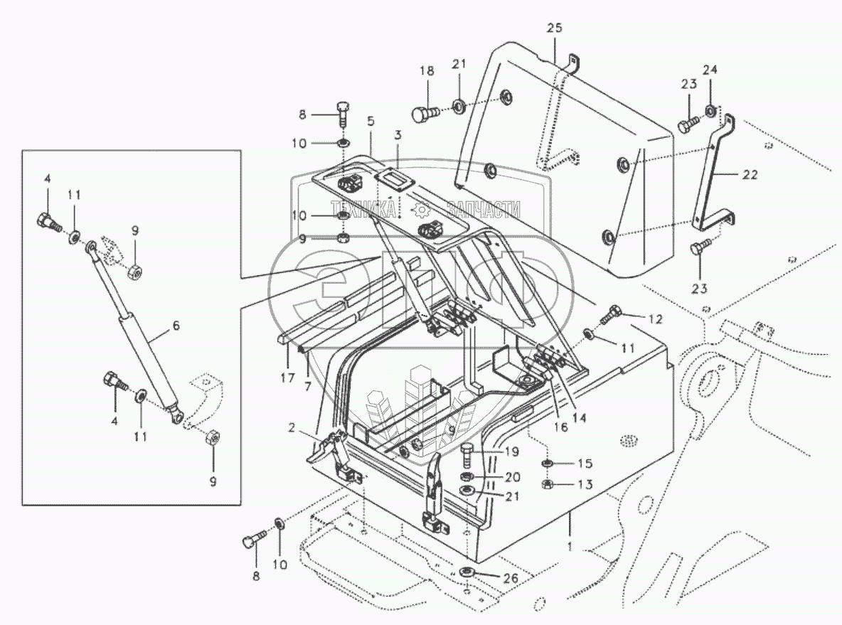 Каталог запасных частей к технике: SDLG LG6150E. 11212924 Tool box, cowl
