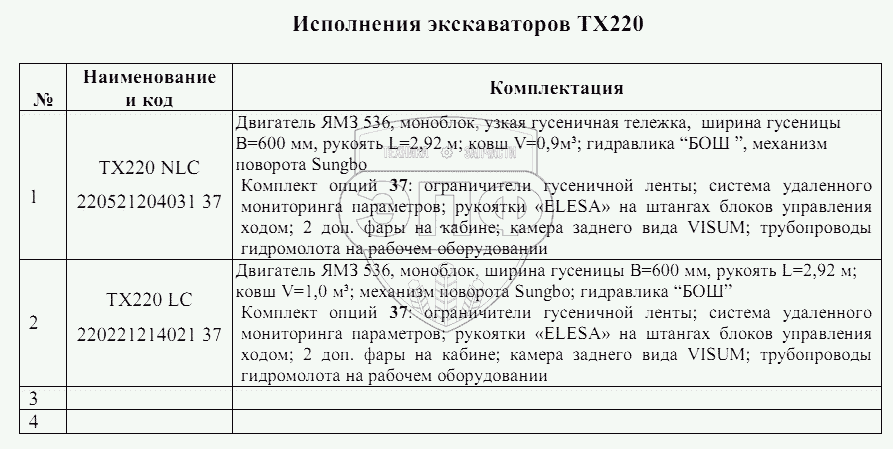 Каталог запасных частей к технике: ТВЭКС ТХ-220. Исполнения экскаваторов ТХ220