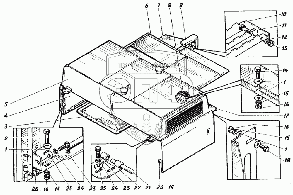 Каталог запасных частей к технике: ВЭКС ЭО-5221. Установка капотов
