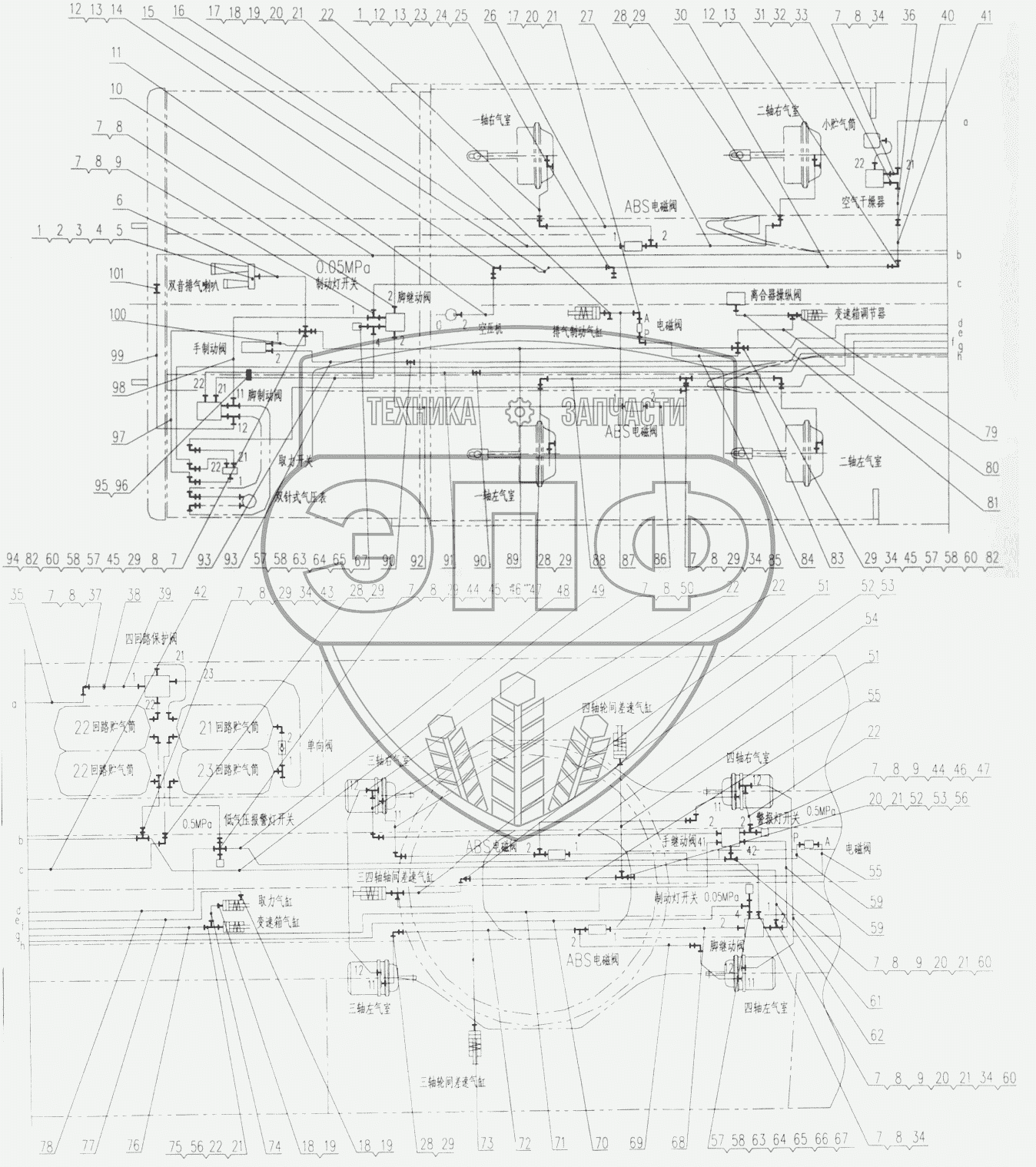 Каталог запасных частей к технике: XCMG QY50K (вариант). XZ50K.42II Pneumatic System Pipe Assembly